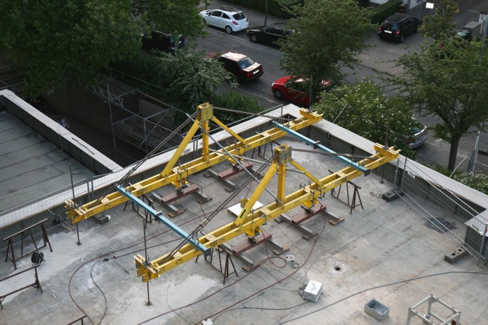 Mit zerstörungsfreien Untersuchungen konnten geschossweise alle zugänglichen Flächen analysiert werden. Es wurde festgestellt, dass bereichsweise Störungen des Verbundes innerhalb der Stahlbetondecke entstanden sind. Die Tragsicherheit wurde angezweifelt, so dass vorgeschlagen wurde, den Nachweis ausreichender Tragsicherheit auf experimentellem Weg zu führen.